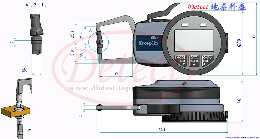 KROEPLIN646E-101数显式厚度测量卡规,测量范围为0.00mm-10.00mm,最大测量深度:35mm;测点形式为平形Φ6,用途为:外径测量