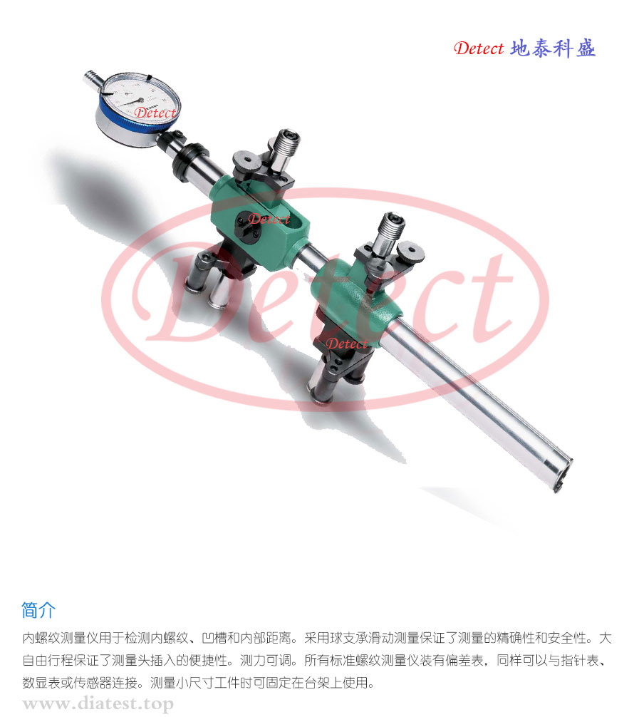 比较法测量,通过更换测头可测量螺纹的中径、大径、和小径。精度高,耐磨损。30mm以下内螺纹,测头为专用,30mm以上内螺纹同螺距可公用。用于快速大批量检测,调整螺纹加工设备。